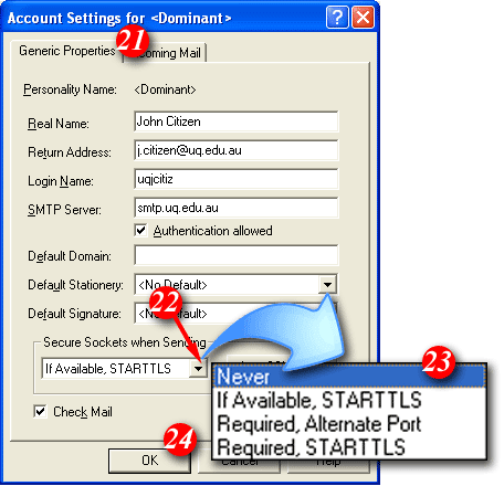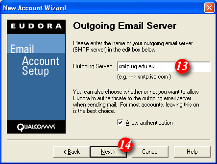 8)By default Eudora will enter part of your email address as the username. Delete this information and enter your 'email address' (for example: me@mydomain.com). | ||