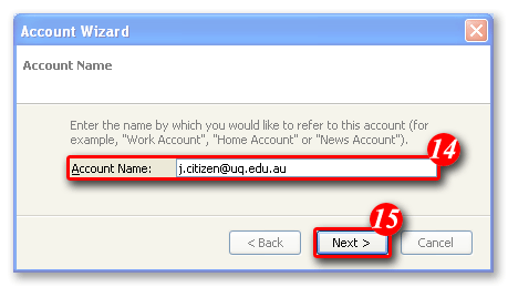 | 14)Thunderbird will automatically enter your email address as the account name. (It is recommended that you leave this 'as is'). |